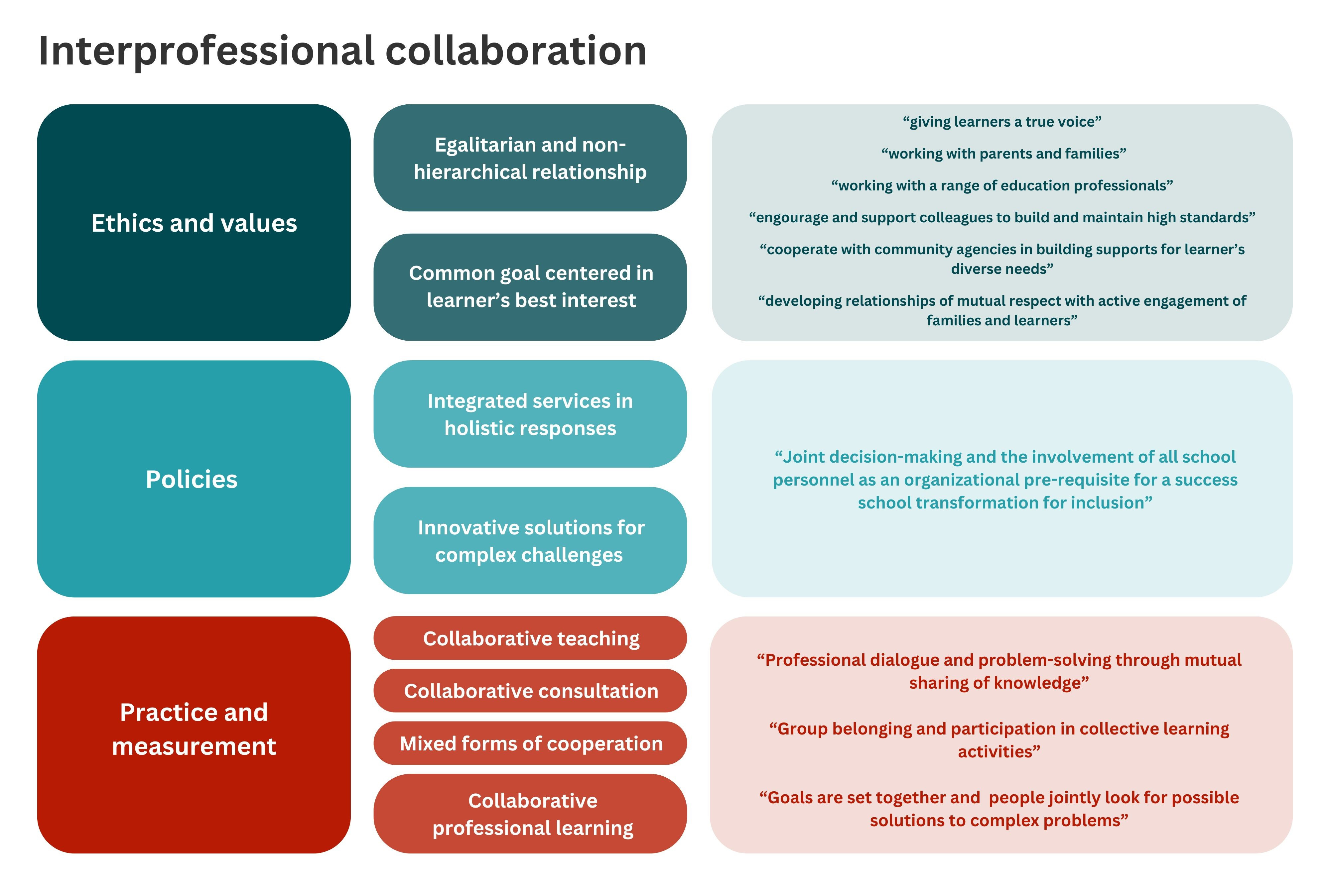 Collaboration is defined as a style of interaction where all participants have equal status and a shared commitment to achieving common goals (Friend, 2000). Egalitarian, non-hierarchical relationships are foundational, as all team members contribute valuable insights (Kampwirth, 2006). Ethical principles are central to interprofessional collaboration in inclusive education and emphasise building relationships with professionals from different fields based on mutual respect, actively involving learners and their families, and cooperating with community agencies to meet learners' diverse needs. A key shared value is prioritising the best interests of students, aiming for optimal learning outcomes while respecting their dignity, culture, and background.