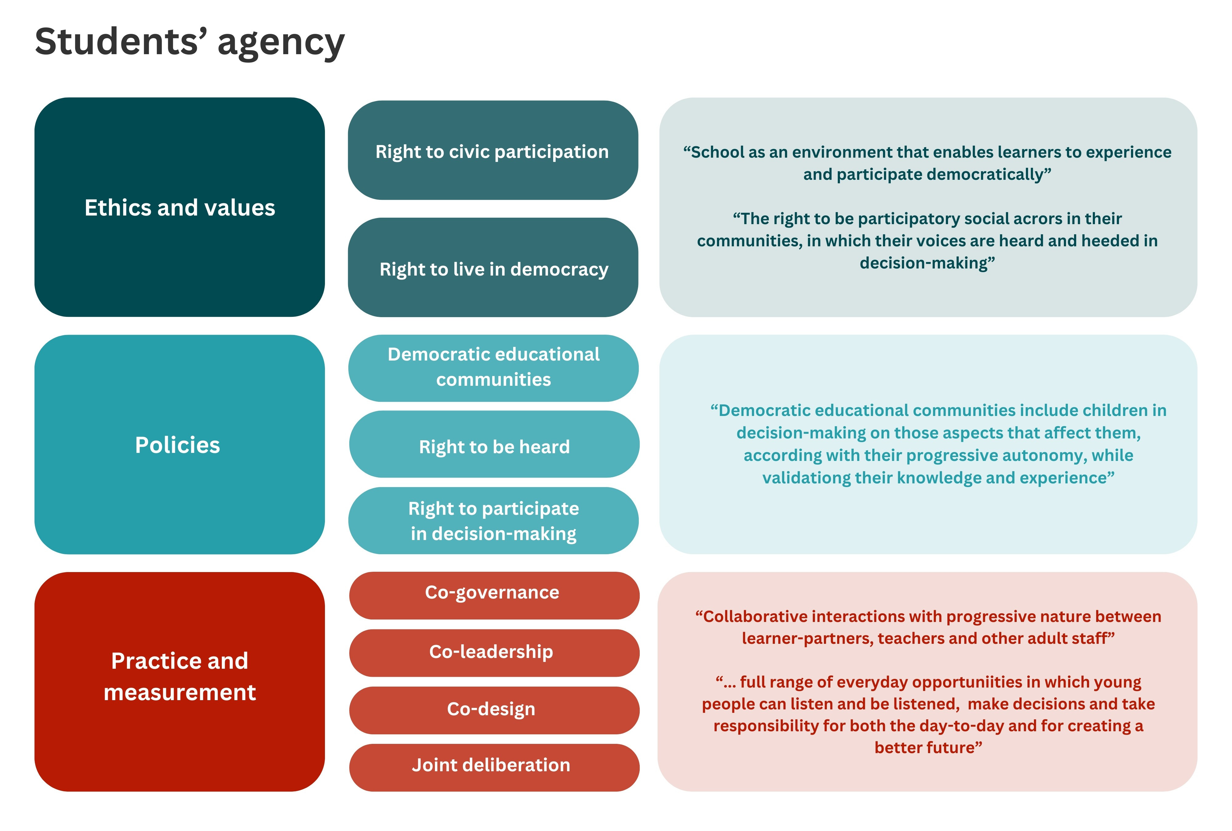 From a policies standpoint, the right of students to be agentic, is claimed as a transformation towards inclusive systems characterized by democratic educational communities that include children in “decision-making on those aspects that affect them, according to their progressive autonomy, while validating their knowledge and experiences” (Esteban, 2022, p.43). Democratisation of school life is then a main driving force of policies concerning students’ agency.